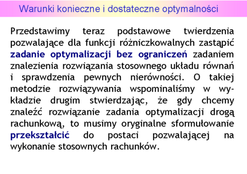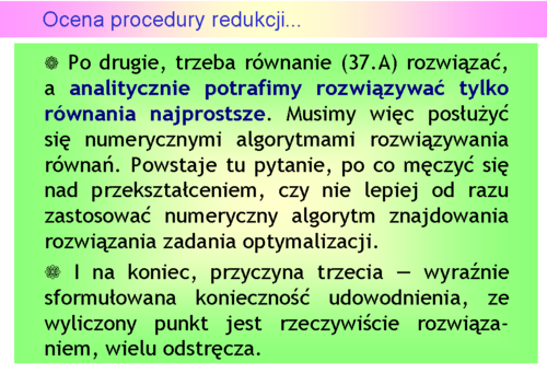 Piękny rezultat teoretyczny, sprowadzający procedurę redukcji do układu równań wyłącznie do rachunków: liczenia pochodnych i rozwiązywania równań, czyli do takiego postępowania, które zastosowaliśmy z ochotą lecz błędnie w przykładzie. Trzeba tylko policzyć macierz Hessego by stwierdzić wypukłość funkcji celu i zastanowić się nad sposobem rozwiązania stosownych równań, ale odpadają zagadnienia związane z dowodem istnienia rozwiązania.