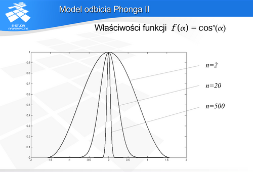 jest jednakowe dla wszystkich obiektów. Drugi składnik opisuje odbicie rozproszone tak zwane lambertowskie. Powierzchnie matowe; rozpraszające światło jednakowo we wszystkich kierunkach opisane są prawem Lamberta, zgodnie z którym światłość promieniowania odbitego jest proporcjonalne do kosinusa kata padania. Oczywiście rzeczywiste powierzchnie rozpraszające zachowują się zgodnie z tym prawem tylko w pewnym zakresie kąta. Niemniej jednak taki opis odbicia rozproszonego jest najczęściej stosowany w modelach odbicia. Trzeci składnik opisuje odbicie kierunkowe (zwierciadlane). Maksimum natężenia promieniowania światła odbitego występuje dla zerowego kąta
