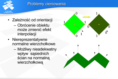 Obie metody są wrażliwe na orientację cieniowanego obiektu. Jeśli obiekt ma różne jasności w wierzchołkach i zostanie obrócony, to interpolacja da różne efekty w zależności od położenia obiektu. W obu metodach liczy się hipotetyczny wektor normalny w wierzchołku wielościanu na podstawie średniej arytmetycznej wektorów normalnych sąsiadujących ścian. Może to spowodować powstanie błędnie skierowanych wektorów interpolowanych. Na dolnym rysunku wektory interpolowane wewnętrznych ścian będą inaczej skierowane niż rzeczywiste wektory normalne. Dodatkowo powstaje nieoczekiwany wpływ ścian sąsiednich. Ruch jednaj ściany zewnętrznej spowoduje zmianę hipotetycznego wektora normalnego w wierzchołku (przez wpływ na średnią), a w konsekwencji tego zmianę wektora interpolowanego ściany wewnętrznej.