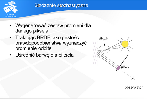 - Śledzenie stochastyczne, kiedy promienie wysyłane są na zasadzie próbkowania pewnego obszaru, również odbicie (załamanie) światła jest modelowane na zasadzie funkcji prawdopodobieństwa, która określa w którym kierunku odbije się (załamie) promień.