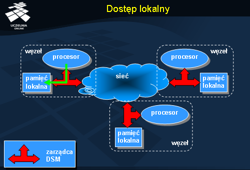 Pierwsze polega na wykonywaniu zdalnego dostępu do danych. W podejściu tym każdy dostęp do współdzielonego obiektu, zlokalizowanego fizycznie w pamięci lokalnej innego węzła, odbywa się przez sieć. Wymaga to oczywiście przesłania komunikatów, co wiąże się ze znacznymi opóźnieniami. Zaletą tego podejścia jest jego prostota. W systemie jest jedna kopia danych, do której się wszyscy odwołują.