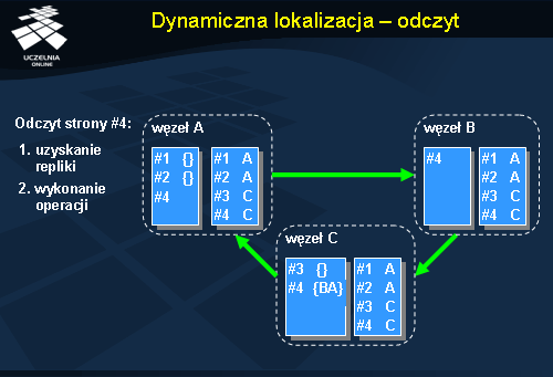 Trzecie rozwiązanie to zastosowanie dynamicznej lokalizacji. Jest to podejście oparte na wskaźnikach naprowadzających, opisywanych na wykładzie dotyczącym nazewnictwa. Każdy węzeł posiada tablicę odwzorowującą lokalizację poszczególnych stron. Tablica ta nie koniecznie zawiera aktualne i prawdziwe informacje. Jest to informacja o prawdopodobnej lokalizacji stron. Lokalizacja strony polega na wysłaniu zapytania do serwera, który jest podejrzewany o jej przechowywanie. Jeżeli jest to prawdą, odesłany zostanie komunikat z potwierdzeniem. Jeżeli nie, zapytanie zostanie przesłane do węzła, który jest podejrzewany przez węzeł właśnie odpytywany, itd. Na rysunku węzły oznaczone są etykietami w kwadratach. Węzeł S1 wysyła zapytanie do S2, bo podejrzewa właśnie S2 o posiadanie poszukiwanej strony. S2 jednak jej nie posiada i przekazuje zapytanie do S3, bo podejrzewa właśnie S3. S3 faktycznie stronę posiada i odpowiada węzłowi S1.