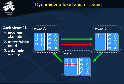 Realizacja operacji dostępu do danych w przypadku stosowania rozproszonej statycznej lokalizacji wygląda bardzo podobnie. Jedyna różnica polega na wyborze węzła, który pełni rolę zarządcy. Komunikat lokalizujący stronę wysyłany jest do węzła, któremu przypisano funkcję zarządzania odpowiednią stroną, a nie do centralnego zarządcy.