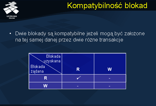 Wprowadzimy obecnie pojęcie kompatybilności blokad. Mówimy, że dwie blokady są kompatybilne jeżeli mogą być założone na tej samej danej przez dwie różne transakcje. Macierz kompatybilności blokad przedstawiono na slajdzie. Jak łatwo zauważyć, kompatybilne są blokady do odczytu, natomiast pozostałe kombinacje blokad (RW, WR, WW) są niekompatybilne.