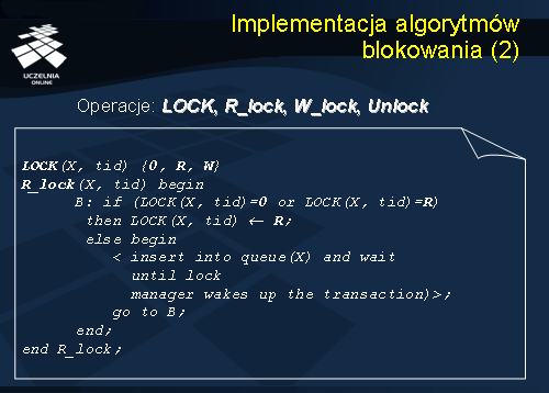 Niniejszy slajd przedstawia algorytm odblokowania danej X przez transakcję tid. Jeżeli dana X była blokowana w trybie do zapisu (W) przez transakcję tid, wówczas, następuje zdjęcie blokady do zapisu (dana X jest niezablokowana) i dostęp do danej X uzyskuje pierwsza transakcja z kolejki transakcji oczekujących na dostęp do danej X. Jeżeli dana X była blokowana w trybie do odczytu (R) przez transakcję tid, wówczas następuje zdjęcie blokady do odczytu dla tej transakcji. Jeżeli transakcja tid była jedyną transakcją blokującą daną X do odczytu, wówczas, po zdjęciu blokady przez transakcję tid, dana X znajdzie się w stanie – nie zablokowana. Jeżeli natomiast, równolegle z transakcją tid dana X była blokowana do odczytu przez inne transakcje, wówczas, po zdjęciu blokady przez transakcję tid, dana X znajdzie się w stanie - zablokowana do odczytu.