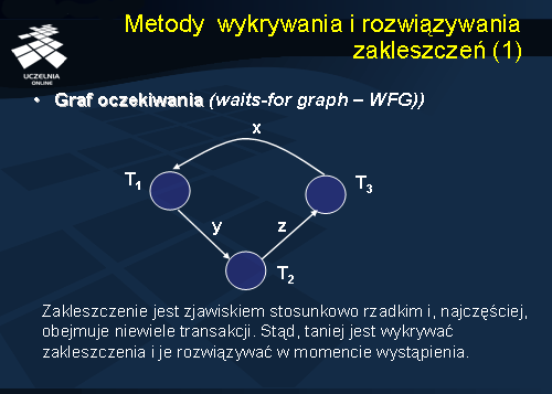 Przykładowo, na grafie FWG przedstawionym na slajdzie transakcja T1 oczekuje na zwolnienie danej Y blokowanej przez transakcję T2. Transakcja T2 oczekuje na uwolnienie danej Z blokowanej przez transakcję T3, która, z kolei oczekuje na zwolnienie danej X blokowanej przez transakcję T1.