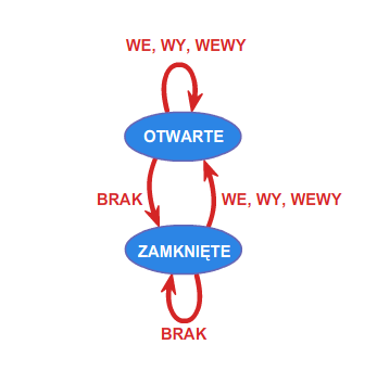 Drzwi automatycznie otwierane są sterowane automatem, którego działanie opisać można, przyjmując następujące oznaczenia. Fakt, że osoba chce wejść do pomieszczenia zamykanego przez takie drzwi, identyfikowany przez odpowiedni czujnik, opiszemy symbolem \(\displaystyle WE\). Zamiar wyjścia symbolem \(\displaystyle WY\). Symbol \(\displaystyle WEWY\) będzie związany z równoczesnym zamiarem wejścia jakiejś osoby i wyjścia innej. Wreszcie symbol \(\displaystyle BRAK\) oznaczał będzie brak osób, które chcą wejść lub wyjść. Zatem zbiór \(\displaystyle \{ WE, WY,WEWY,BRAK \}\), to alfabet nad którym określimy automat o \(\displaystyle 2\) stanach: \(\displaystyle OTWARTE, ZAMKNIĘTE\) poniższym grafem.