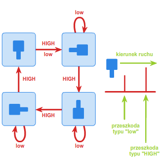 Należy zatem skonstruować takie urządzenie (orienter), które będzie ustawiało wszystkie detale w żądanej orientacji. Oczywiście istnieje wiele metod rozwiązania tego problemu, ale z praktycznego punktu widzenia potrzebne jest rozwiązanie najprostsze i najtańsze. Jednym z takich sposobów jest umieszczanie detali na pasie transmisyjnym z zamontowaną wzdłuż niego pewną ilością przeszkód dwojakiego rodzaju: niskich (low) oraz wysokich (HIGH). Wysoka przeszkoda ma tę własność, że każdy detal, który ją napotka, zostanie obrócony o 90 stopni w prawo (zakładamy, że elementy jadą od lewej do prawej strony). Przeszkoda niska obróci o 90 stopni w prawo tylko te detale, które są ułożone "wypustką" w dół. Na rys. 5 przedstawione zostały przejścia pomiędzy orientacjami detali w zależności od napotkania odpowiedniej przeszkody.