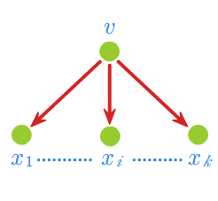 Na wstępie przypomnijmy, że każda produkcja jakiejkolwiek gramatyki bezkontekstowej \(\displaystyle G = (V_N,V_T,v_0,P)\) ma postać \(\displaystyle v \rightarrow x_1\ldots.x_k\) lub \(\displaystyle v \rightarrow 1\), gdzie \(\displaystyle v \in V_N\;,\; x_i \in (V_N \cup V_T)\). Często korzystać będziemy z możliwości przedstawienia graficznego takiej produkcji. Mianowicie każdej produkcji odpowiada etykietowane drzewo z wyróżnionym wierzchołkiem początkowym.