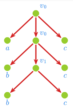 Niech \(\displaystyle G = (V_N,V_T,v_0,P)\), gdzie \(\displaystyle V_N = \{v_0, v_1\}, V_T = \{a,b,c\},\)