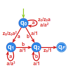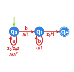 Zauważmy, że automat ten rozpoznaje ten sam język zarówno zarówno przez stany końcowe ( \(\displaystyle Q_{F}=\{q_{F}\}\) ), jak i w sensie rozpoznawania przez pusty stos.