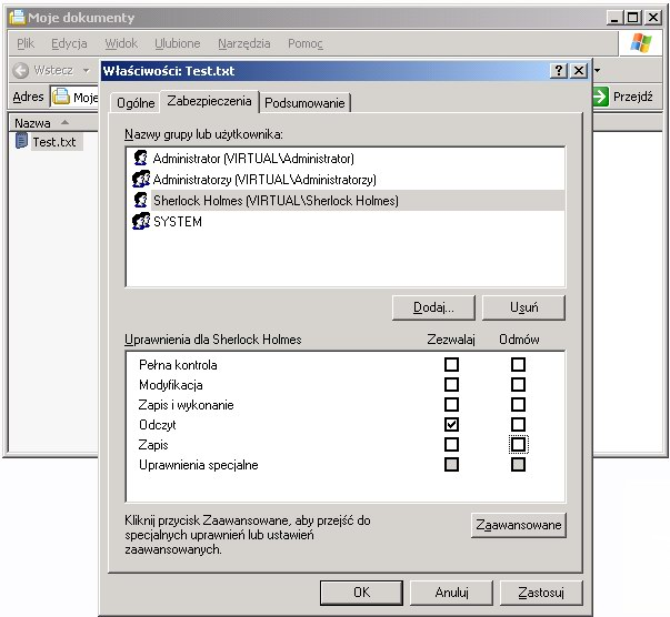 % getfacl plik-testowy # file: plik-testowy # owner: janek # group: bsk user::rw- group::r-- other::r--