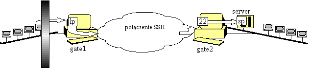 Szyfrowane propagowanie połączeń jest metodą realizacji tuneli wirtualnych na poziomie warstwy aplikacji. Oferuje je np. protokół SSH. Działanie mechanizmu propagowanie połączeń można przedstawić następująco (rysunek 12).