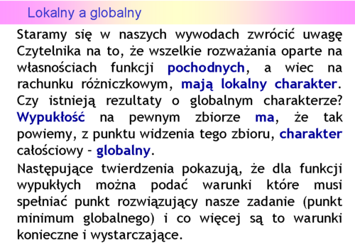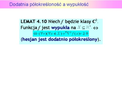 Piękny rezultat teoretyczny, sprowadzający procedurę redukcji do układu równań wyłącznie do rachunków: liczenia pochodnych i rozwiązywania równań, czyli do takiego postępowania, które zastosowaliśmy z ochotą lecz błędnie w przykładzie. Trzeba tylko policzyć macierz Hessego by stwierdzić wypukłość funkcji celu i zastanowić się nad sposobem rozwiązania stosownych równań, ale odpadają zagadnienia związane z dowodem istnienia rozwiązania.