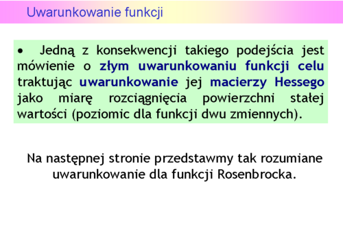 Widać, ze funkcja Rosenbrocka jest dobrze dobrana jako “tor badania sprawności” dla różnych algorytmów. Tylko w centralnej części (tam gdzie nie ma minimum) jej uwarunkowanie jest mniejsze od pięciu, a w okolicy minimum jest większe od 500.