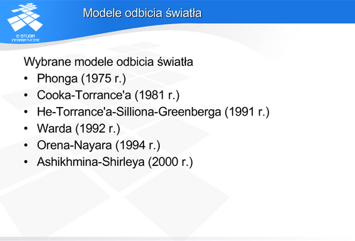 jest jednakowe dla wszystkich obiektów. Drugi składnik opisuje odbicie rozproszone tak zwane lambertowskie. Powierzchnie matowe; rozpraszające światło jednakowo we wszystkich kierunkach opisane są prawem Lamberta, zgodnie z którym światłość promieniowania odbitego jest proporcjonalne do kosinusa kata padania. Oczywiście rzeczywiste powierzchnie rozpraszające zachowują się zgodnie z tym prawem tylko w pewnym zakresie kąta. Niemniej jednak taki opis odbicia rozproszonego jest najczęściej stosowany w modelach odbicia. Trzeci składnik opisuje odbicie kierunkowe (zwierciadlane). Maksimum natężenia promieniowania światła odbitego występuje dla zerowego kąta