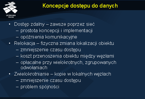 Pierwsze polega na wykonywaniu zdalnego dostępu do danych. W podejściu tym każdy dostęp do współdzielonego obiektu, zlokalizowanego fizycznie w pamięci lokalnej innego węzła, odbywa się przez sieć. Wymaga to oczywiście przesłania komunikatów, co wiąże się ze znacznymi opóźnieniami. Zaletą tego podejścia jest jego prostota. W systemie jest jedna kopia danych, do której się wszyscy odwołują.