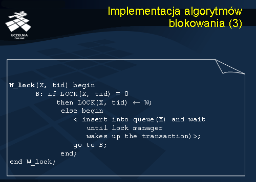 Niniejszy slajd przedstawia algorytm odblokowania danej X przez transakcję tid. Jeżeli dana X była blokowana w trybie do zapisu (W) przez transakcję tid, wówczas, następuje zdjęcie blokady do zapisu (dana X jest niezablokowana) i dostęp do danej X uzyskuje pierwsza transakcja z kolejki transakcji oczekujących na dostęp do danej X. Jeżeli dana X była blokowana w trybie do odczytu (R) przez transakcję tid, wówczas następuje zdjęcie blokady do odczytu dla tej transakcji. Jeżeli transakcja tid była jedyną transakcją blokującą daną X do odczytu, wówczas, po zdjęciu blokady przez transakcję tid, dana X znajdzie się w stanie – nie zablokowana. Jeżeli natomiast, równolegle z transakcją tid dana X była blokowana do odczytu przez inne transakcje, wówczas, po zdjęciu blokady przez transakcję tid, dana X znajdzie się w stanie - zablokowana do odczytu.