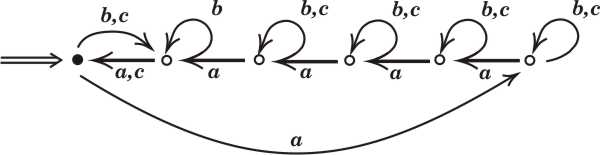 Zakładając, że następujący automat deterministyczny \(A_{n}\) ma \(n\) stanów (\(n\geq 2\), na rysunku \(n=6\)), dowieść, że jakikolwiek automat deterministyczny rozpoznający lustrzane odbicie języka \(L(A_{n})\) ma co najmniej \(2^{n}\) stanów (por. zadanie ?? na str. ?? ).