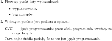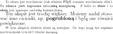 Widzimy, że rozmiar i krój mogą być zagnieżdżone. Nie można zagnieżdżać krojów. Istotny jest zawsze ostatnio wybrany krój. Pełną listę krojów i rozmiarów można znaleźć w dokumentacji latexa.