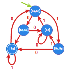 \(\displaystyle q_0=\{s_{0}\}, q_1=\{s_{1}\}, q_2 = \{s_2,s_{4}\}, q_3 =\{s_{3},s_5\}\), \(\displaystyle T=\{q_1 ,q_2\}\).