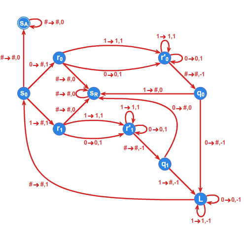 W miejsce tabeli wygodniej jest zobrazować funkcję przejść maszyny Turinga na etykietowanym grafie skierowanym. Zostało to zrobione na poniższym rysunku: